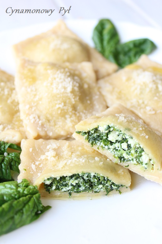 Ciasto na ravioli robiłam chyba ze cztery razy , za każdym razem korzystałam z innego przepisu i za każdym razem ciasto było twarde i gumiaste 😦 W końcu zdecydowałam się na zrobienie ravioli z wypróbowanego przeze mnie ciasta na pierogi . To był strzał w dziesiątkę ! Nie dodawałam jajek jak w innych przepisach lecz tylko 1 żółtko . Ciasto wyszło miękkie i delikatne , takie jak chciałam , do tego genialny farsz ze szpinakiem i serem ricotta …… Pycha !