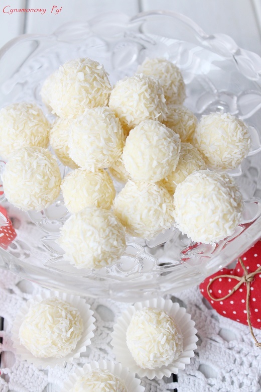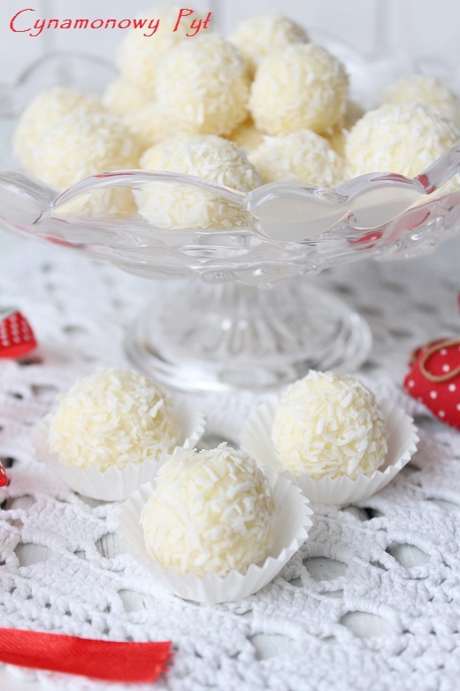 Śmietankę kremówkę ubijamy na sztywno z łyżką cukru pudru. Powoli, małym strumieniem wlewamy białą czekoladę nie przerywając miksowania. Na końcu delikatnie łyżką mieszamy z wiórkami kokosowymi.